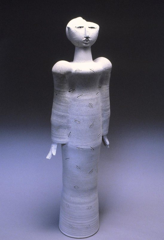 Two of her sculptures are part of a 2017-2018 exhibition at Los Angeles County Museum of Art. Her “Warrior” evokes ancient West Mexican statues in its expressive face and bold geometric structure. It references an approximately two thousand year old slip-painted earthenware figure from Nayarit, Mexico.