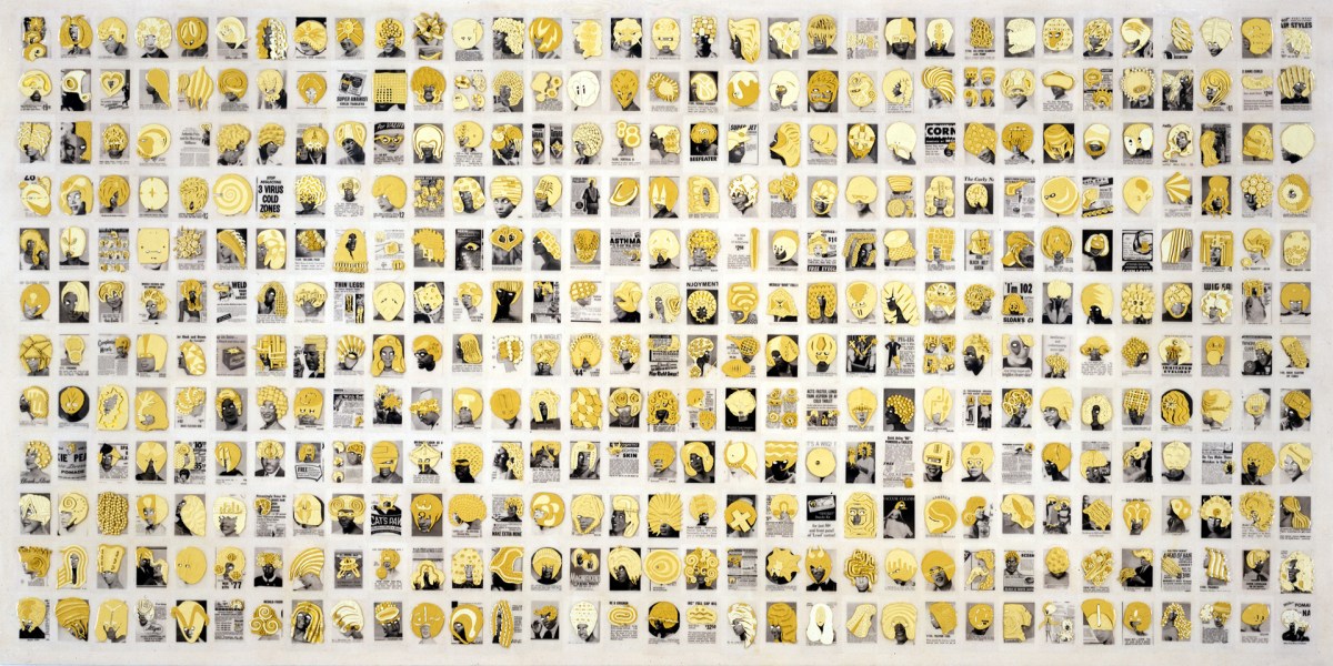 Ellen Gallagher is an American artist of both non-representational and figurative works of painting, paper, drawing, collage, film, and video. Gallagher’s abstraction and image-based narratives derive from found materials, which come from magazines, posters, journals, and advertising. These function as the base for her paintings and drawings with only traces of the original remaining. Themes relating to race are evident in her work, sometimes through pictographs, repetitions, and codes. At times there are references to Black minstrel shows scattered throughout her works.