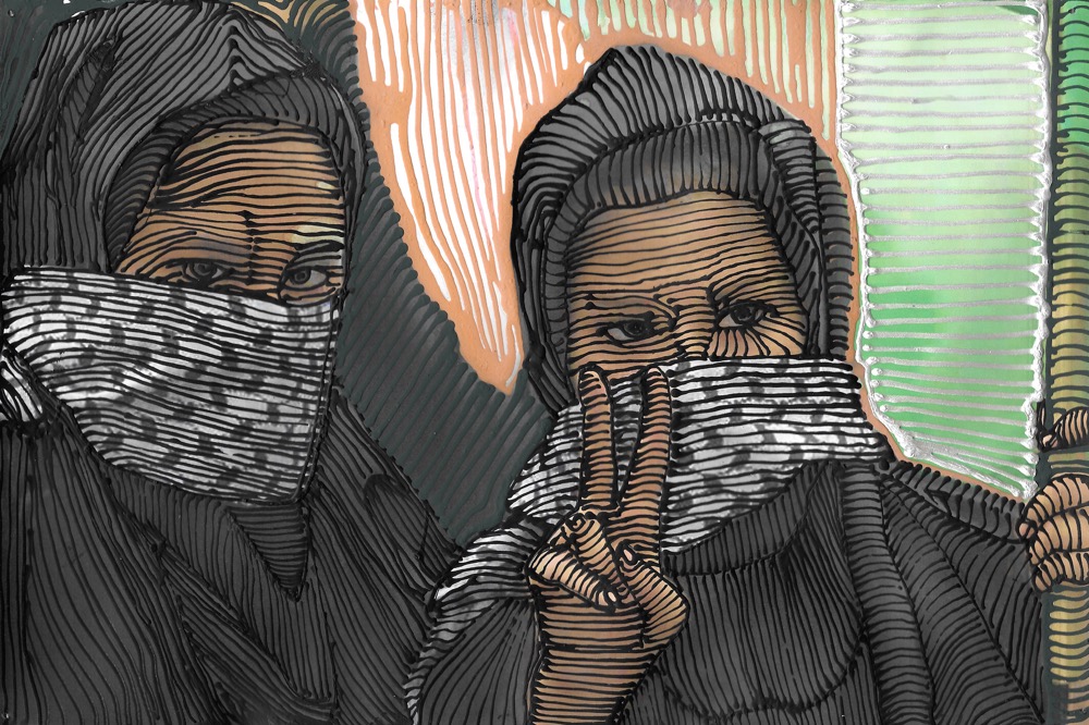 Her “Mowing the Lawn” series is named after an Israeli military term of attack. She has created 52 small panels to document the atrocity on the part of the Israeli military in their 2014 assault on the civilians of Gaza. Delicate lines in black, blue, yellow, and red come together to cover horrific photographs of people killed in this attack. Because she is Jewish she “can’t talk about this with my family.” But she knows that there are “enough people who are Jewish” who see the wrong in this military action.