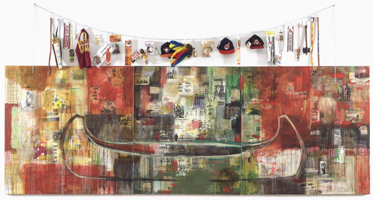 In the recent exhibition at the National Museum of the American Indian, “Stretching the Canvas: Eight Decades of Native Painting,” one of the works presented was Smith’s 2015 “Trade Canoe: Adrift.” This acrylic painting showed a birch-bark canoe in front of a vivid yellow sky, floating on yellow and blood red water. The canoe is filled with constricted Syrian refugees, fish, and masks. In this painting she combines recognition of Indigenous land rights with various worldwide migrant crises.