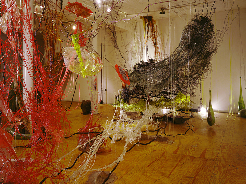 Pfaff’s installations grow organically within their site-specific spaces as she accumulates, subtracts, and refines their element. There is no focal point, but rather an environment which is to be explored and experienced. While she has a strong idea about what the installation will look like, she never knows exactly what will happen. She uses a myriad of objects: vines stained with dye, foil, welded steel, rope, lights, foam board, etc.