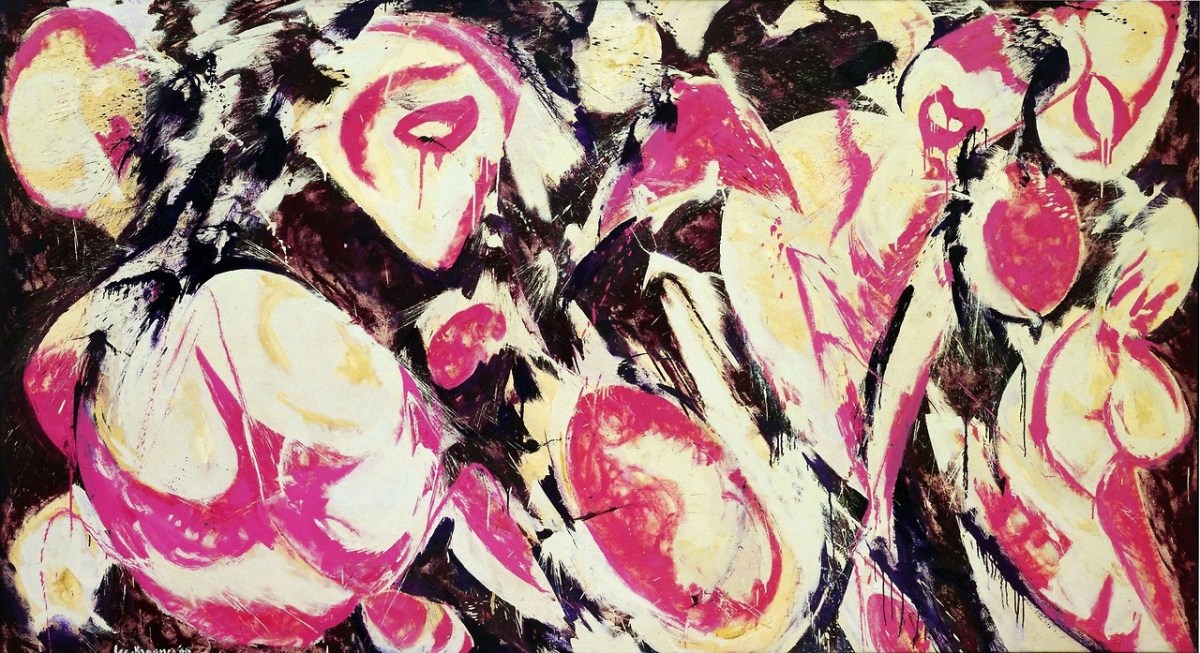 After her mother’s death in 1959 and an operation on an aneurysm in 1962, Krasner dealt with themes of birth and renewal as she pressed on with her creative life. She was most radiantly herself in a series of watercolor, pastel, and crayon works from 1962 on. In 1963, her broken wrist forced her to make finger-scale paint strokes in paintings “Bird Image” and “Flowering Limb.” This last painting had a blend of brown, orange, yellow, and pink in fantastic combinations.