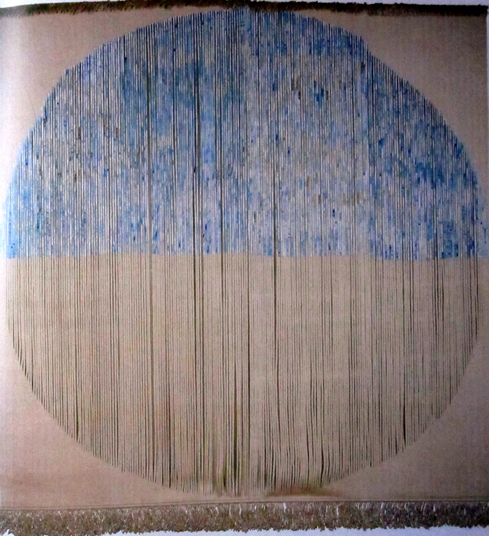 After 1977, Tawney created her “Cloud Series,” which consisted of thousands of shimmering linen threads attached to an immense blue canvas, suspended from canvas supports. For her 1990 retrospective, Tawney reconfigured this work, stitching together two of the clouds and deciding that each of the thousands of hanging threads needed to be twenty feet long, twice the length of the thread in the original work.