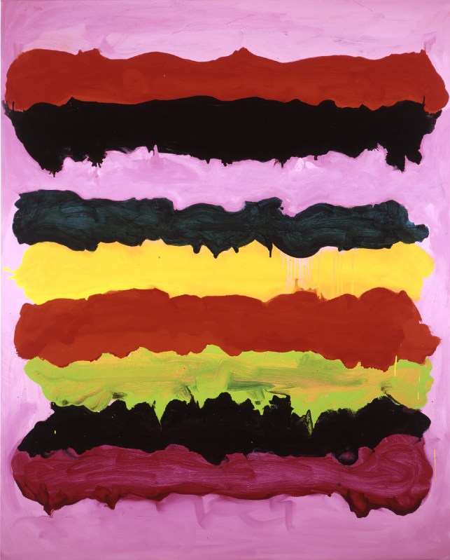 In 1968, she moved to New York and had a relationship with Gordon Matta-Clark. She had uneasy friendships with rising stars like Carl Andre, Keith Sonnier, and Robert Smithson, because she knew that they, like most people, were not taking female artists seriously. In 1969, when nothing of Heilmann’s made the cut for the Whitney’s “Anti-Illusion: Procedures/Materials” – a show that included many of her male friends – she “started making paintings that dissed paintings.”