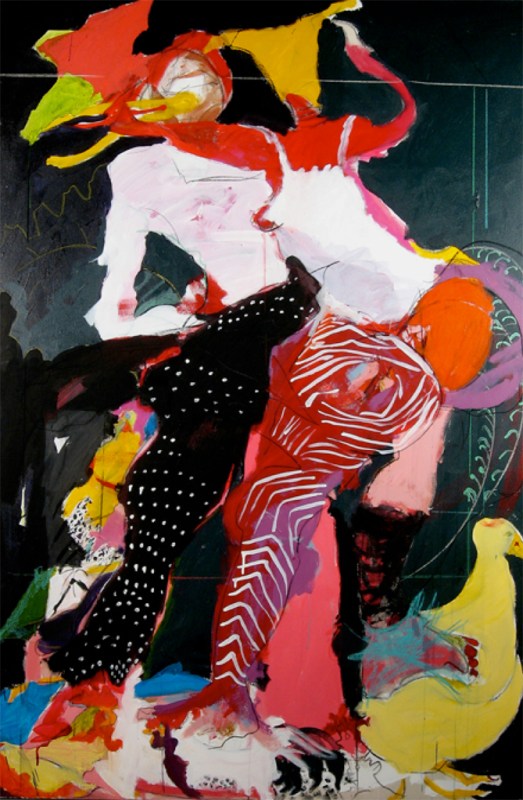 In later works her abstractions solidify and indicate persons and objects often jumbled together. Her figurative elements, while barely recognizable, are suggestive of narrative.  Movement and action are conveyed by dynamic brushwork and richness of color.