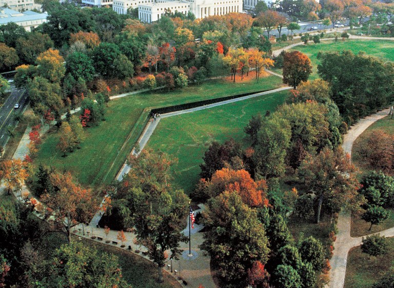 Her Minimalist-inspired design consists of two almost 250-foot-long walls of polished black granite, set into a gradual rise, meeting at a 136 degree angle at the point where the walls and slope would be at their full 10-foot height. The names of the dead were incised in the stone in the order in which they died, with only the dates of the first and last deaths – ‘1959’ and ‘1975’ – recorded. Its mirror-like, polished granite walls have been acclaimed for creating a place of calm and healing as they allow visitors to see their own reflections when they read the names of the dead. Mementos and flowers are left below the names.
