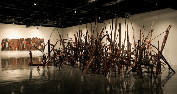Korean-born, New York-based artist Sook Jin Jo has created drawings, collages, photographs, installations, constructions, and public works. Her themes of destruction, reclamation, rejuvenation, and rebirth are made more significant since the materials she often chooses to use are old, abandoned, useless pieces of wood or wooden objects. She uses this wood in various drawings, collages, performance pieces, sculptures, and site-specific installations.