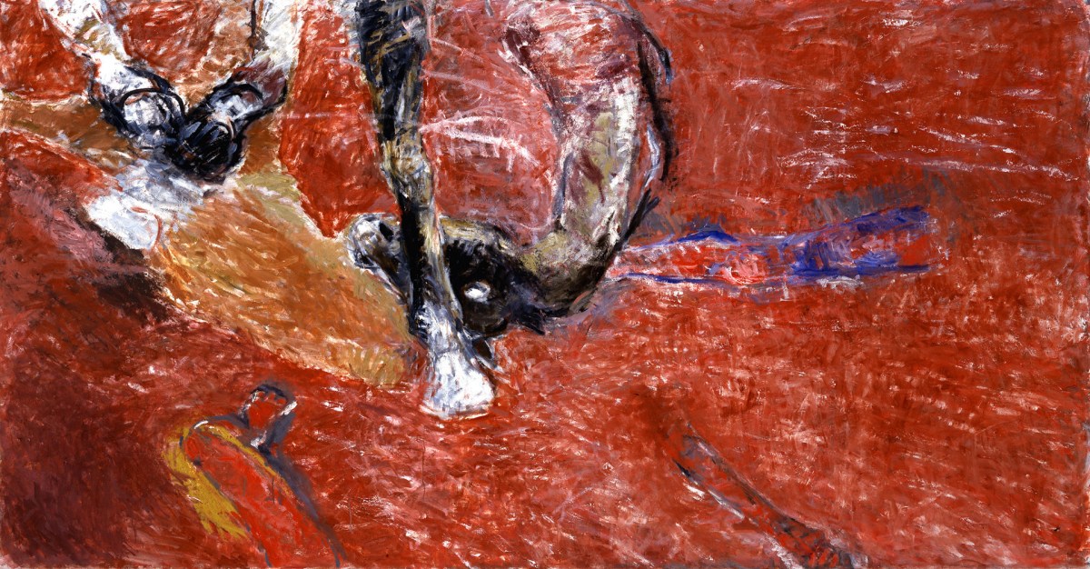 Her 1976 “Cabin Fever” and “Four Color Horse” completed the transition from her late 1960s nonfigurative art to the more representational style that emerged soon after. By the late 1980s her signature beasts morphed into other objects or even actions – a frontal view of a horse became a two-pronged shape; hands would appear – disembodied – alongside heads and sometimes silhouetted by smoke.