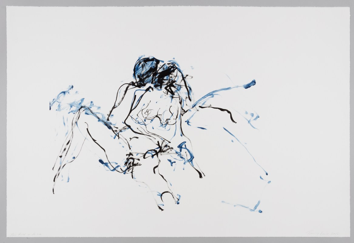 Born in London, Emin grew up in Margate, a town on the south coast of England. In 1987, she moved to London and studied painting at the Royal College of Art. In 1989 to 1990, Emin became pregnant and had an abortion. She stopped art, stopped reading, and – according to her – stopped living. She had already smashed her paintings the year before, and in 1989 she threw a load of them into the trash. She then destroyed everything in 1990. One of the few things that remained was her “After My Abortion,” a 1990 watercolor on paper.