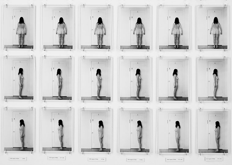 In 1972, she challenged definitions of sculpture, self-portraiture, photographic documentation, and performance art with “Carving: A Traditional Sculpture.” Presented as a grid of 148 black & white photographs, the work shows the transformation of Antin’s own body as she lost ten pounds over thirty-seven days of strict dieting. Each vertical column of four photographs of the naked Antin – showing her from the front, the back, and on each side – represents a day of her performance.