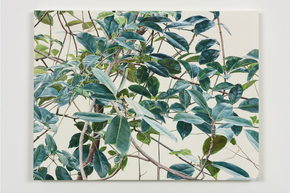 Her most recent work shows her technical mastery when she draws and paints from nature. Her oil painting “2015 Untitled (leaves/branches)” is a tangle of green oval leaves, pitched at different angles to the light, with elegant intertwining of thin, twisting branches. Lately Khedoori started focusing once again on creating large scale paintings on paper.