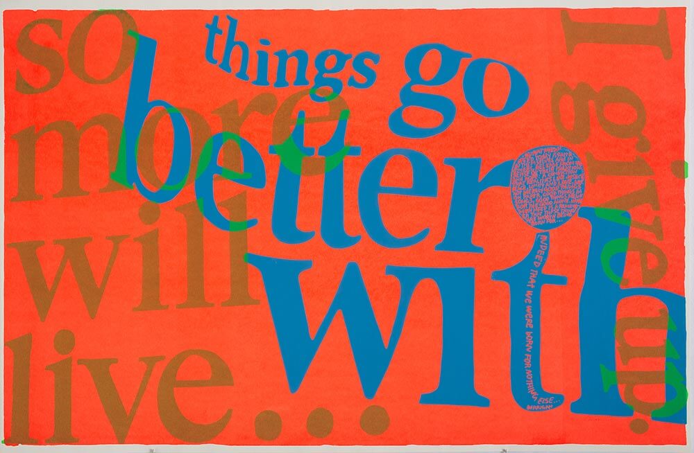 Kent created eye-popping screen prints and drawings that combined appropriated texts and logos from popular culture with excerpts of writing from her favorite authors. She used inventive typography to encourage deeper readings of banal slogans.
