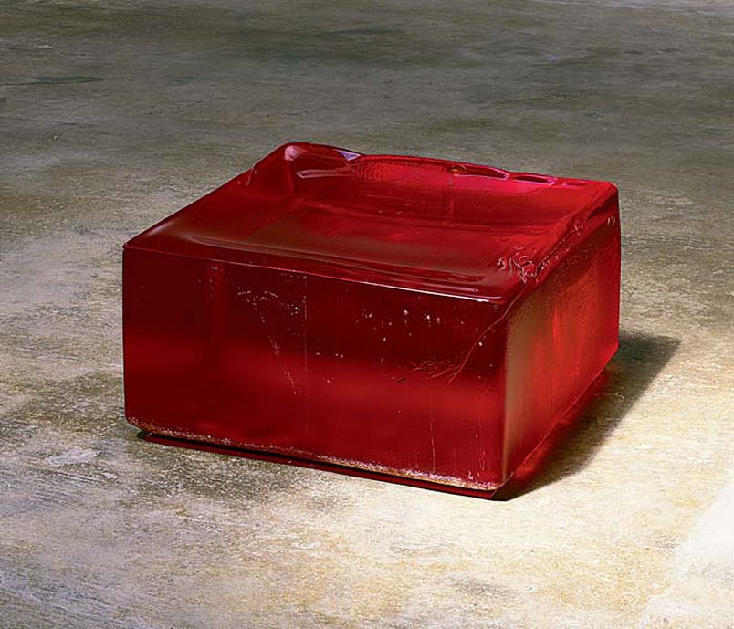 Since the mid-1990s, Horn has been making large, simple colored glass sculptures, which rely on the natural elements causing subtle shifts in appearance. She often makes them in matching pairs, and they take months to cool. It takes some three to four months for the sculptures to cool after the molten glass has assumed the shape of its mold. The sides and bottom of the sculpture have the rough impression of the mold while the top surface is fire-polished and bows in like liquid. Its glossy surface allows the viewer to look into the pristine interiors as if looking down on a body of water through an eyepiece. Her “Pink Tons” molten glass is hazy on the outside but silky smooth on the sunken top.