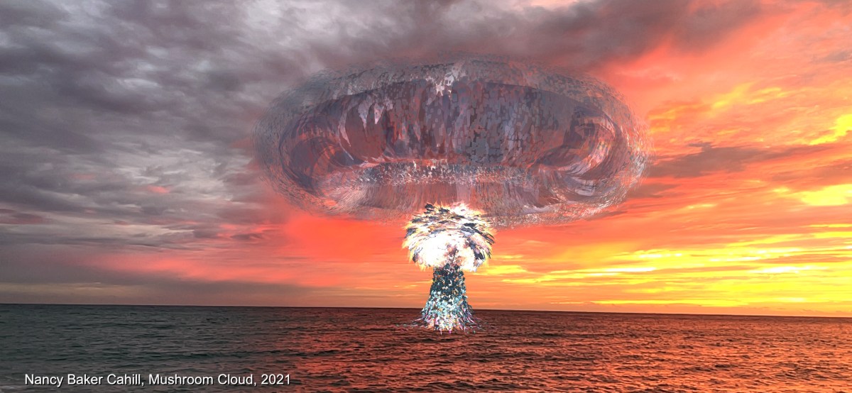 Her AR artwork “Mushroom Cloud” first appeared in Miami Art Week in December, 2021. It was shown again in 2022 as “Mushroom Cloud LA/Proximities” on the West Coast during the Frieze Los Angeles Art Fair. This huge, site-specific piece appeared in the sky over the Pacific Ocean just beyond the Santa Monica Pier. It appeared differently depending on when it was viewed. Standing on the pier and looking through a mobile device held up to the sky, viewers could see an enormous, fiery mushroom cloud rise from the ocean and then explode. There was a soundscape of the sudden boom and accompanying strong wind that mirrored the action of the piece. Yet, this work gave off hope as a beautiful web of lacy threads spread across the sky. To make this AR work, Baker Cahill made a digital drawing of the images in virtual reality software. “Everything I do starts with drawing.” Then her team at Shaking Earth Digital animated it. Baker Cahill also created a two-minute video work “Proximities” which can be seen on her website. It is an abstracted collision of fire and water and features a sound collaboration.