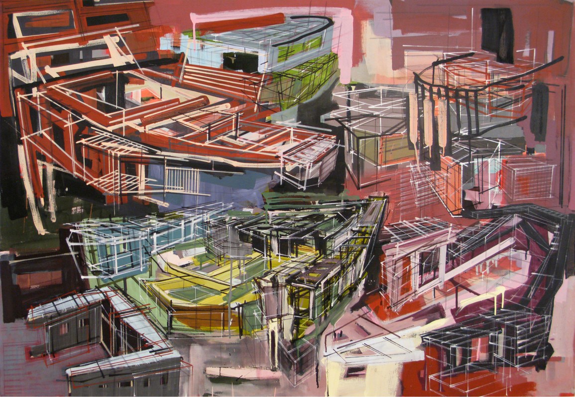In the year 2000, Thomasos began painting on walls. These huge wall works were a way to expand her studio paintings into gigantic murals of architectonic structures. These paintings were a mixture of floor plans, architectural renderings, and illusionistic spaces that allowed her to paint huge amounts of square footage.