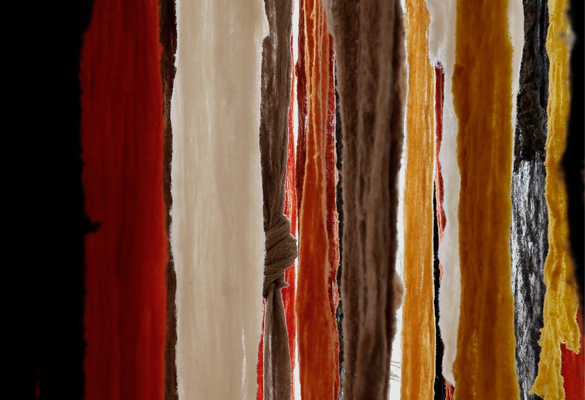 Weaving, associated with women’s work, is critical to Vicuna’s art as she aligns herself with the Indigenous people of the Andes even though she is of Spanish and Basque descent. Her large ‘quipu’ installations are made from skeins of raw wool and often hang loosely from the ceiling. They form frameworks that show the process of their own creation. Each is a seemingly solid floating mass of an ephemeral quality.