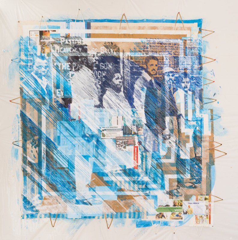 Jackson’s paintings are three-dimensional assemblages that begin with archival or contemporary photographs. To these photo transfers, she adds layers of paper, textiles, embroidery, and prints to tell the narrative of the segregation and displacement of communities of Black, Indigenous, and people of color in the United States. This displacement continues to the present day seizures and foreclosures of homes, owned by Black and Brown people, under the Third Party Transfer (TPT) Program. This Program targets paid-for properties in gentrifying communities, transferring ownership from elderly Black and Brown property owners to developers.