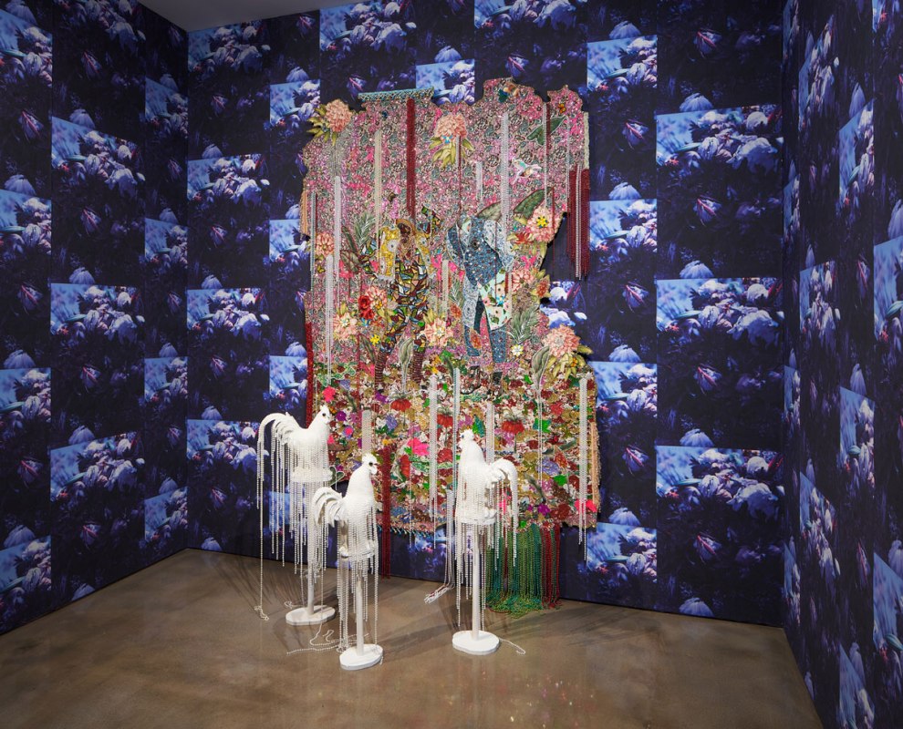 Mixed-media artist Ebony G. Patterson, born in Jamaica, is based in Chicago and Kingston, Jamaica. Patterson creates a multilayered practice in painting, sculpture, installation, performance, and video art. She uses the beauty of tapestry, beading, sequins, crocheting, and photography to address injustice. Floral patterns are often the backdrop of her work. While Patterson sees flowers as decorative and beautiful, she uses gardens in her art as a metaphor for people living in a postcolonial world. Her work addresses gender, racial, social, political, and global issues in colorful pieces that are strong, vivid, and beautiful.